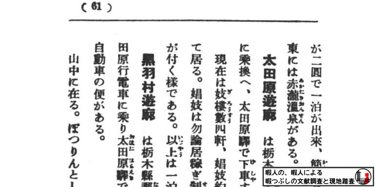 ヒントは「栃木県那須郡にあつて」と「黒羽村遊廓」の名称。 「栃木県那須郡黒羽村」というのはあるのかな?