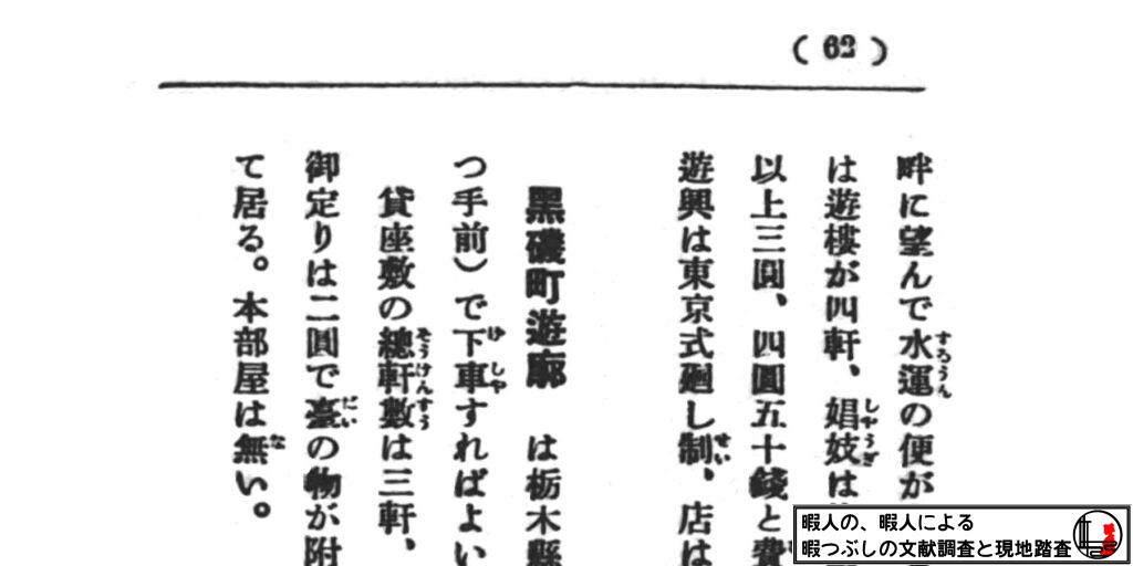 そうなると関連しそうなキーワードで手当たり次第に検索してみて、次の手を考えてみることにします。全文検索で「黒磯駅」「遊廓」「新地」「遊里」等で手当たり次第に検索。こういう馬鹿な検索方法が行えるようになった現代のテクノロジーに感謝です。昔であれば、ページをめくりつつ地道な作業がどうしても必須でしたからね。