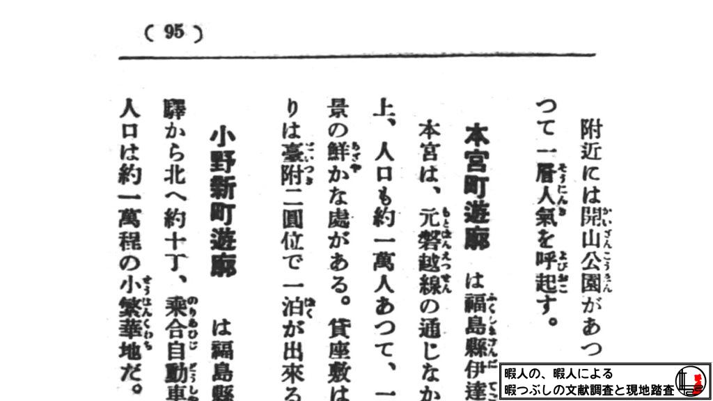 本宮は、元磐越線の通じなかつた時分には、水利による附近の貨物の集散地だつた關係上、人口も約一萬人あつて、一寸した繁華地である。附近には阿武隈の溪谷があつて、風景の鮮かな處がある。貸座敷は四軒あつて、娼妓は十五人程居る。遊興は廻し制で、御定りは臺附二圓位で一泊が出來る。妓樓名は判明してない。『全国遊廓案内』,日本遊覧社,昭和5. 国立国会図書館デジタルコレクション https://dl.ndl.go.jp/pid/1453000 より