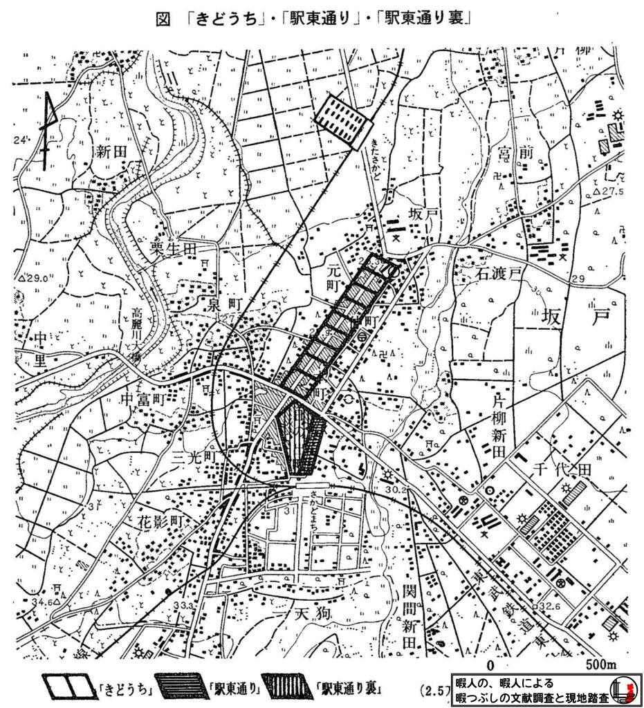 城西大学機関リポジトリにある論文。首都圏の都市成長前線帯におけるサービス業地域の形成 : 埼玉県坂戸町「きどうち」と「駅東通り」の比較というものを発見。1975年のもので、少々古いものですが、こちらにかなりヒントとなる情報がありました。
