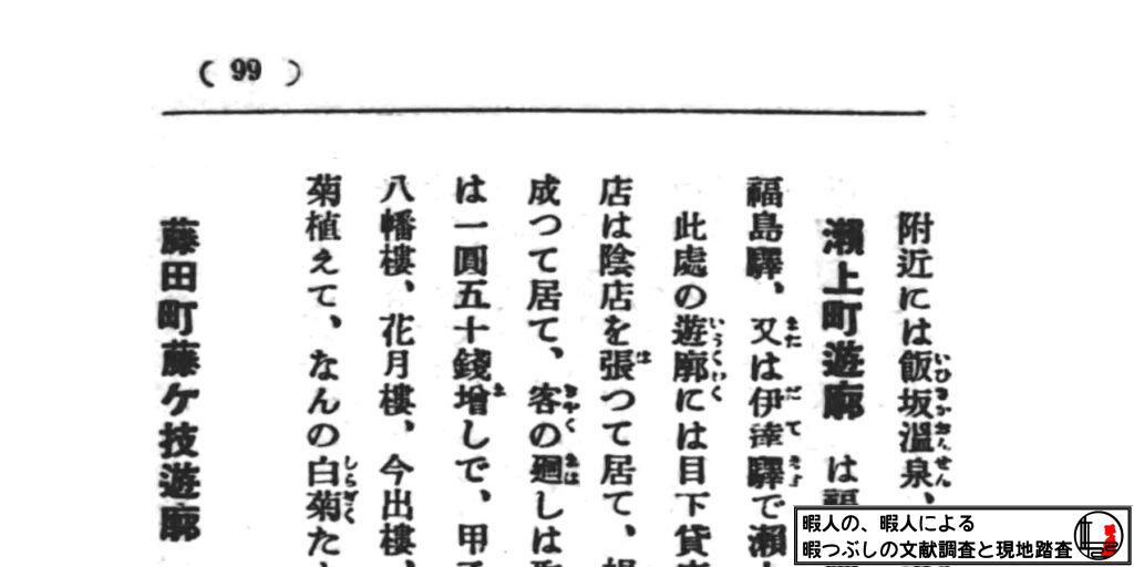 との記載を確認することができた。もともとは街道沿いに点在していた「飯盛女」で栄えた瀬上宿。他の宿と同様に明治三十五年に移転が命ぜられ、瀬上の東裡と呼ばれた薬師前に移転。移転後は六軒の楼で廓をなした。移転当初こそ苦戦したが、その後は盛り返したという事のようである。