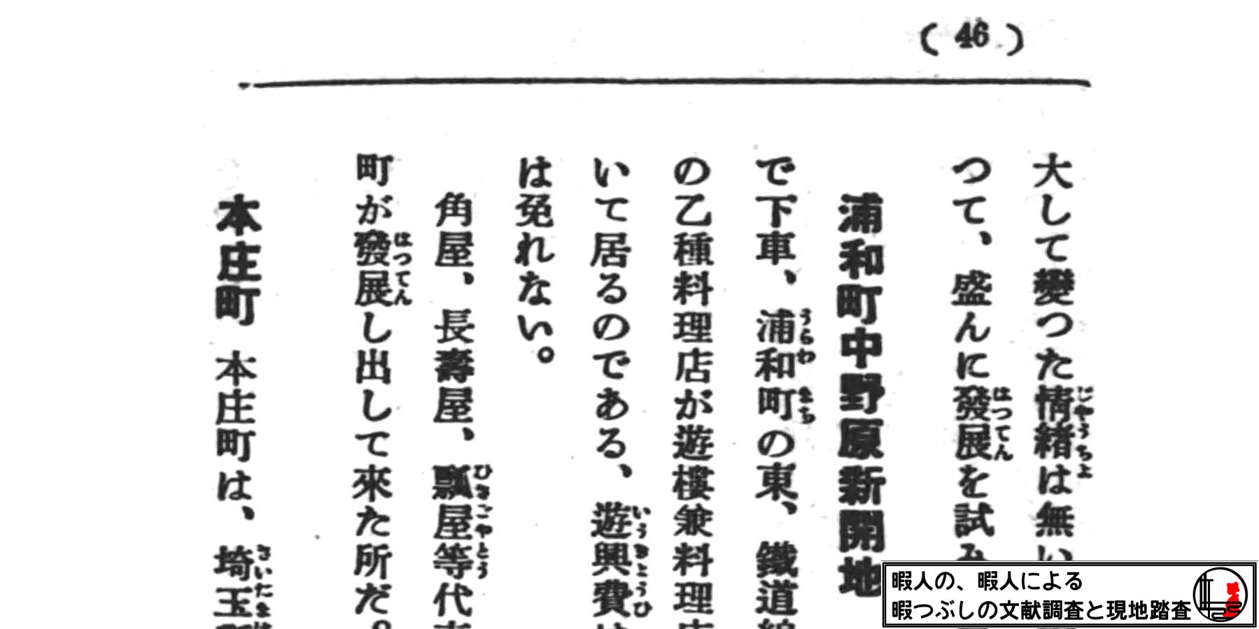 とりあえず安直に、現在の浦和の地図を眺め、「中野原」もしくは「なかのはら」という地名を探します。 でも、いくら地図を眺めても、地名で検索しても見つからず。 全国遊廓案内には「鐡道は東北線浦和驛で下車、浦和町の東、鐡道路線の東方(向ふ側)にあつて」とありますので、現在でいう「東仲町」「東高砂町」「本太」のあたりになるのでしょうけれども、その辺りで似たような地名を探すも見つかりません。